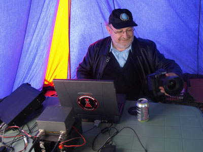 Fabien enregistre mes premiers balbutiements... J'avoue que j'ai le trac ! En effet, le Président du Programme KEO (en rouge) écoute d'une oreille discrète... |